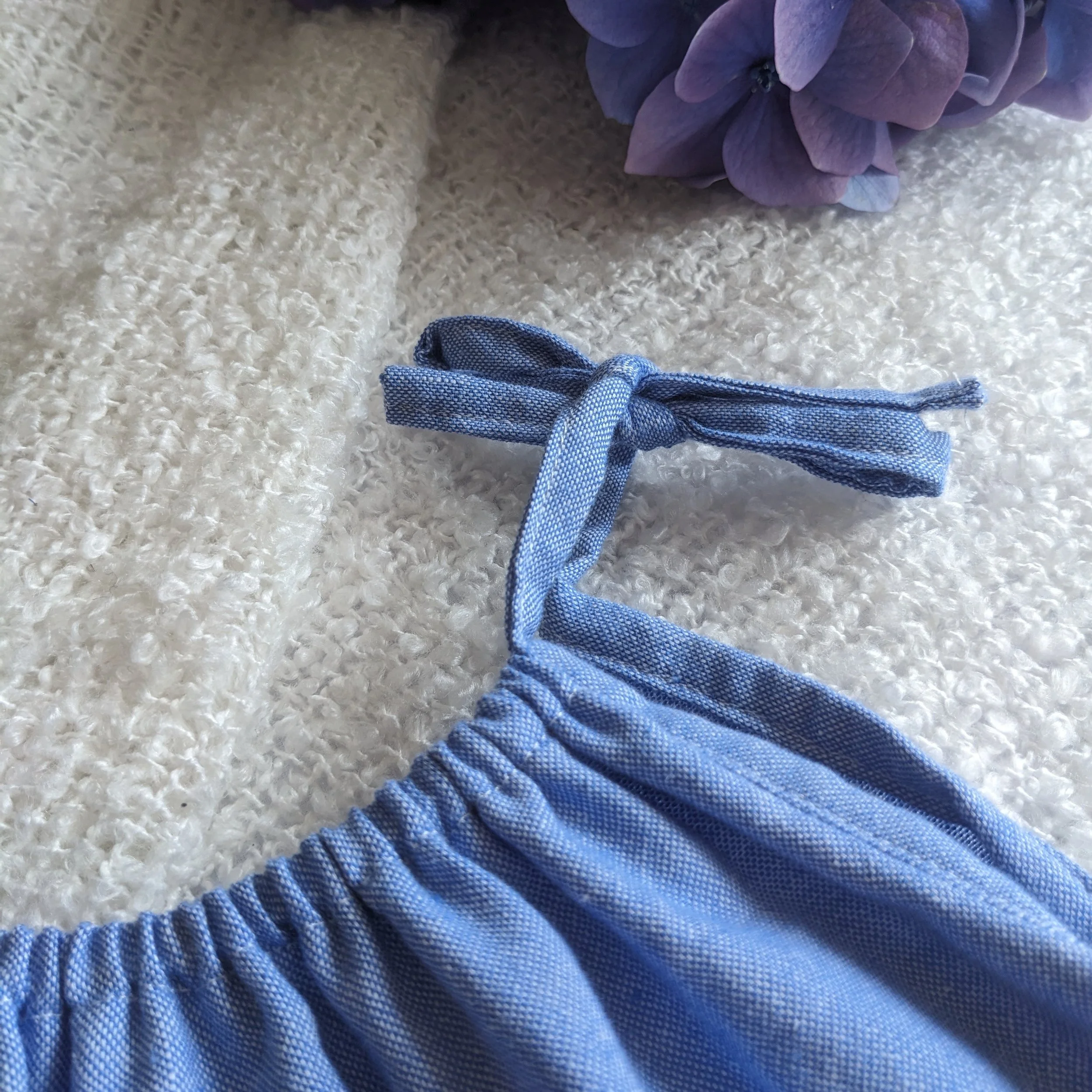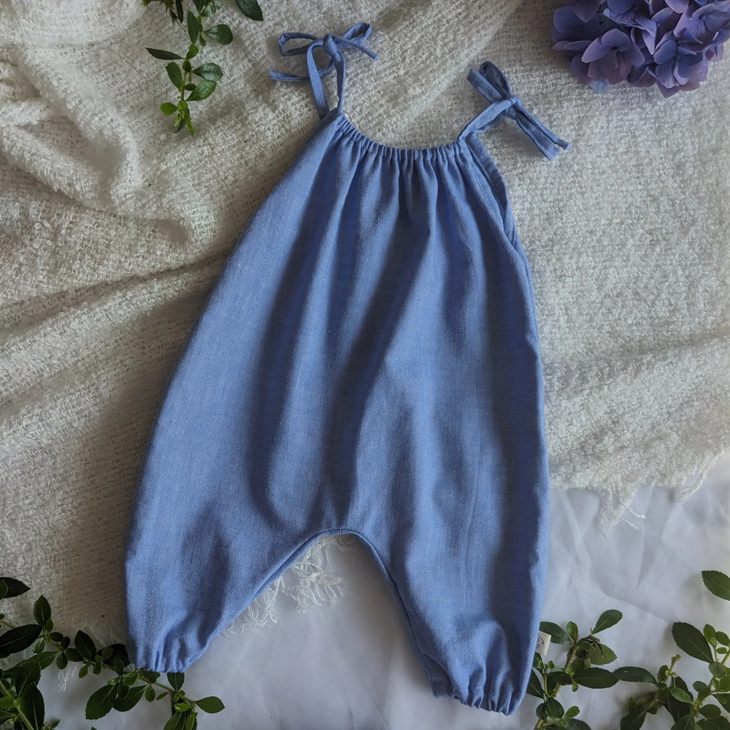 This harem style romper is made with soft cotton jersey. This style and fabric means there is lots of room for your little one to wriggle and explore in comfort and of course, extra room for a cloth bottom!  A snap fastener at each shoulder makes it easy to get on and off especially if you have a little wriggler!